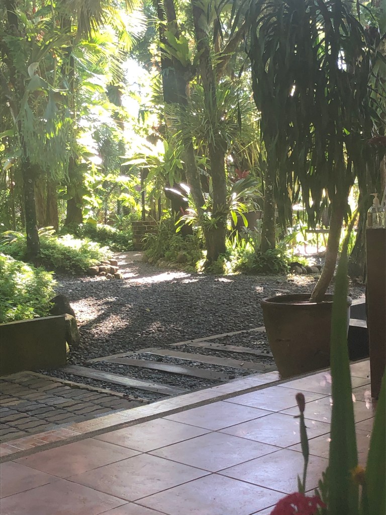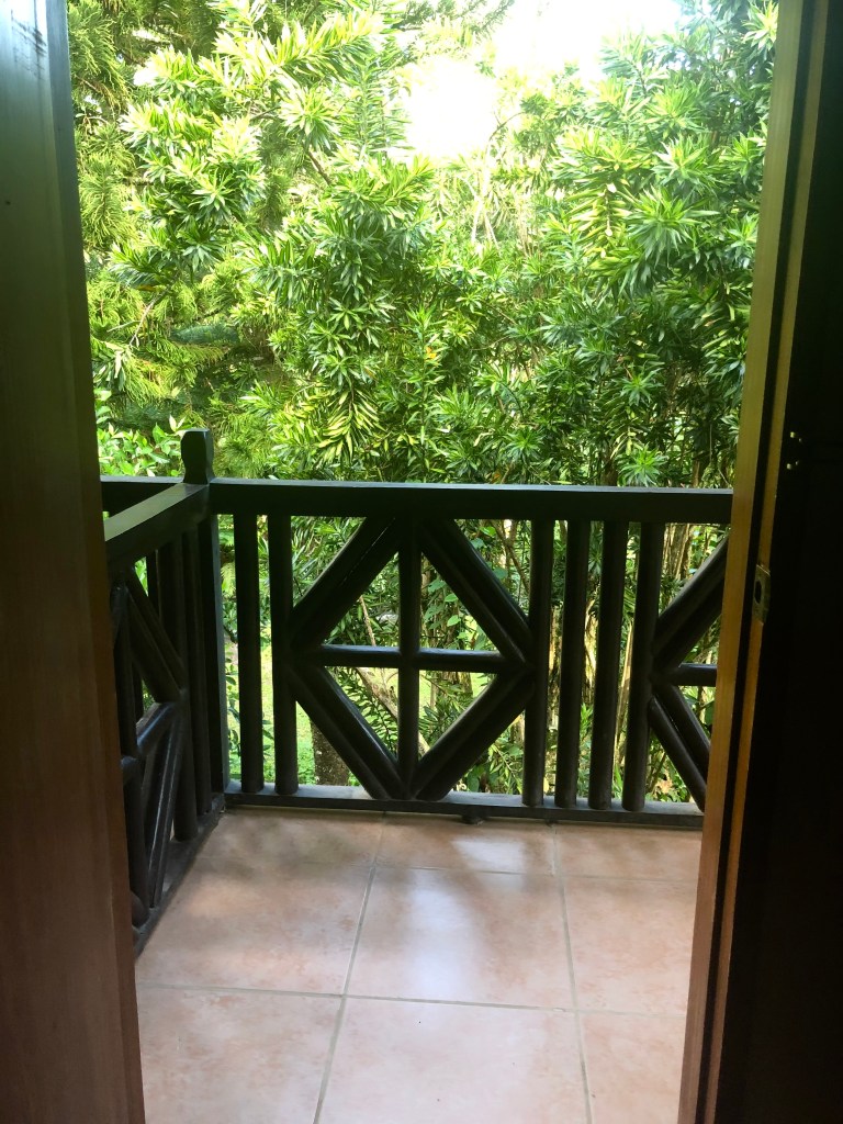 As soon as I arrived, I sensed that I will be pampered from head to toe. Nina seemed to anticipate my needs before I even asked for them. They gave me this large, clean room with a veranda and it overlooked a small stream running down a hill from the left to the right. It was like they knew what my ideal room was. There was a lot of space that it could’ve had a small kitchen with a sink and fridge in it. You could put a queen-sized bed in the bathroom. What clinched it for me was the veranda had two wooden lounge chairs on it overlooking the stream. Water trickling down all day and night was a plus. I’ve a feeling I’d be well rested amidst conjuring up worlds of conflict and interesting characters. The windows had an old world feel in it. It wasn’t glass sliding to open or shut, just wooden shutters that one has to be opened manually.